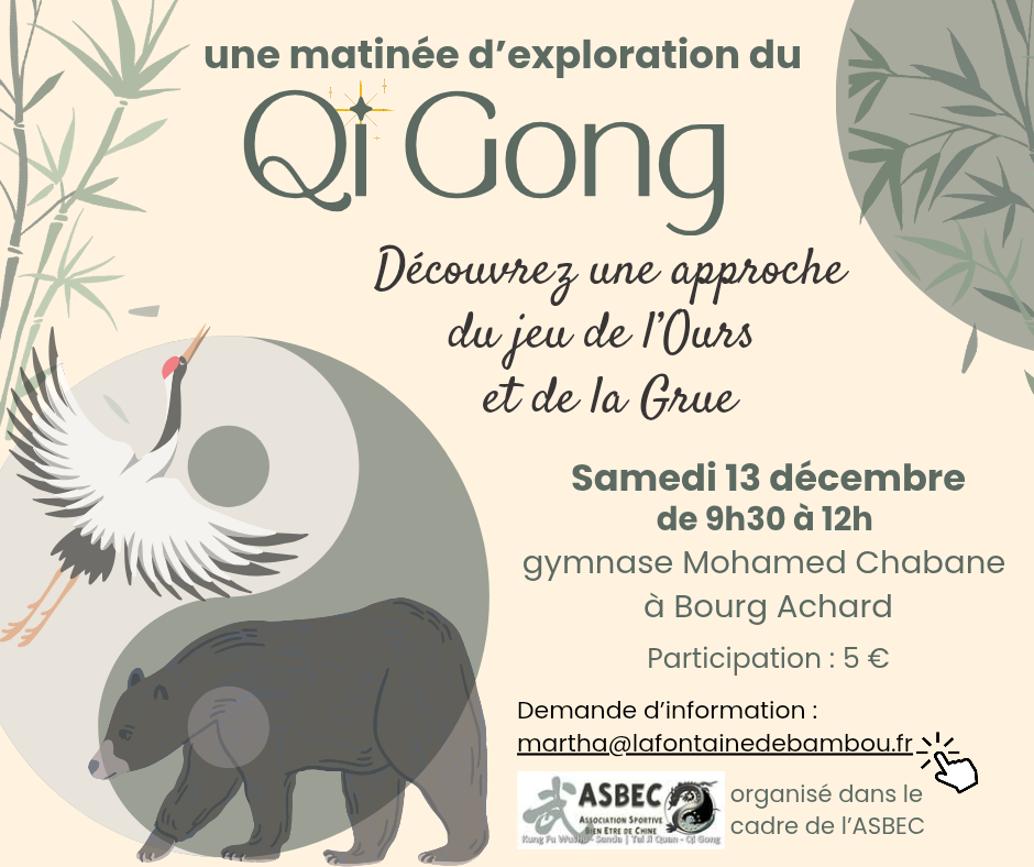 Je vous fais part de l’organisation d’un stage de Qi Gong par l’ASBEC en collaboration avec Martha Metais.